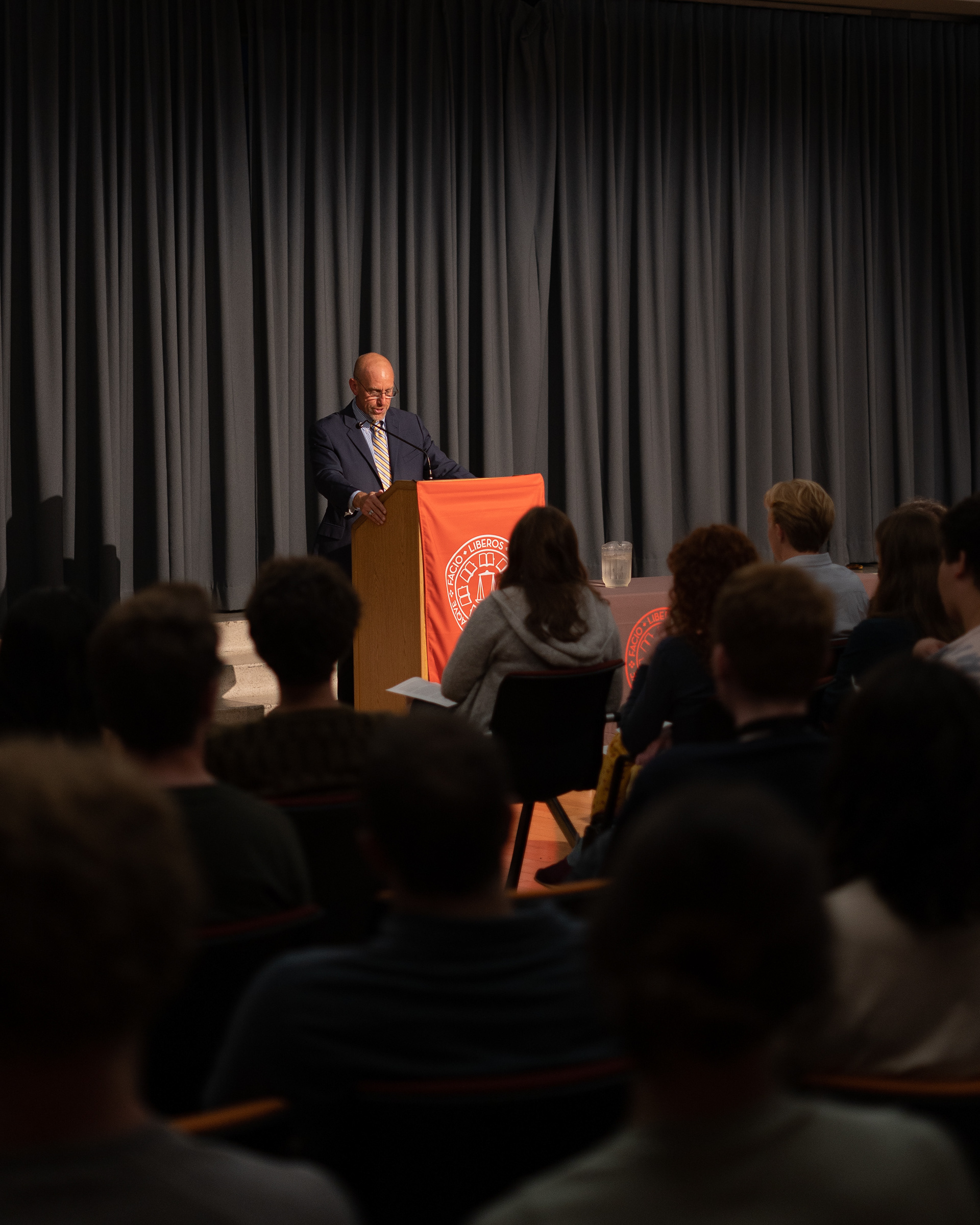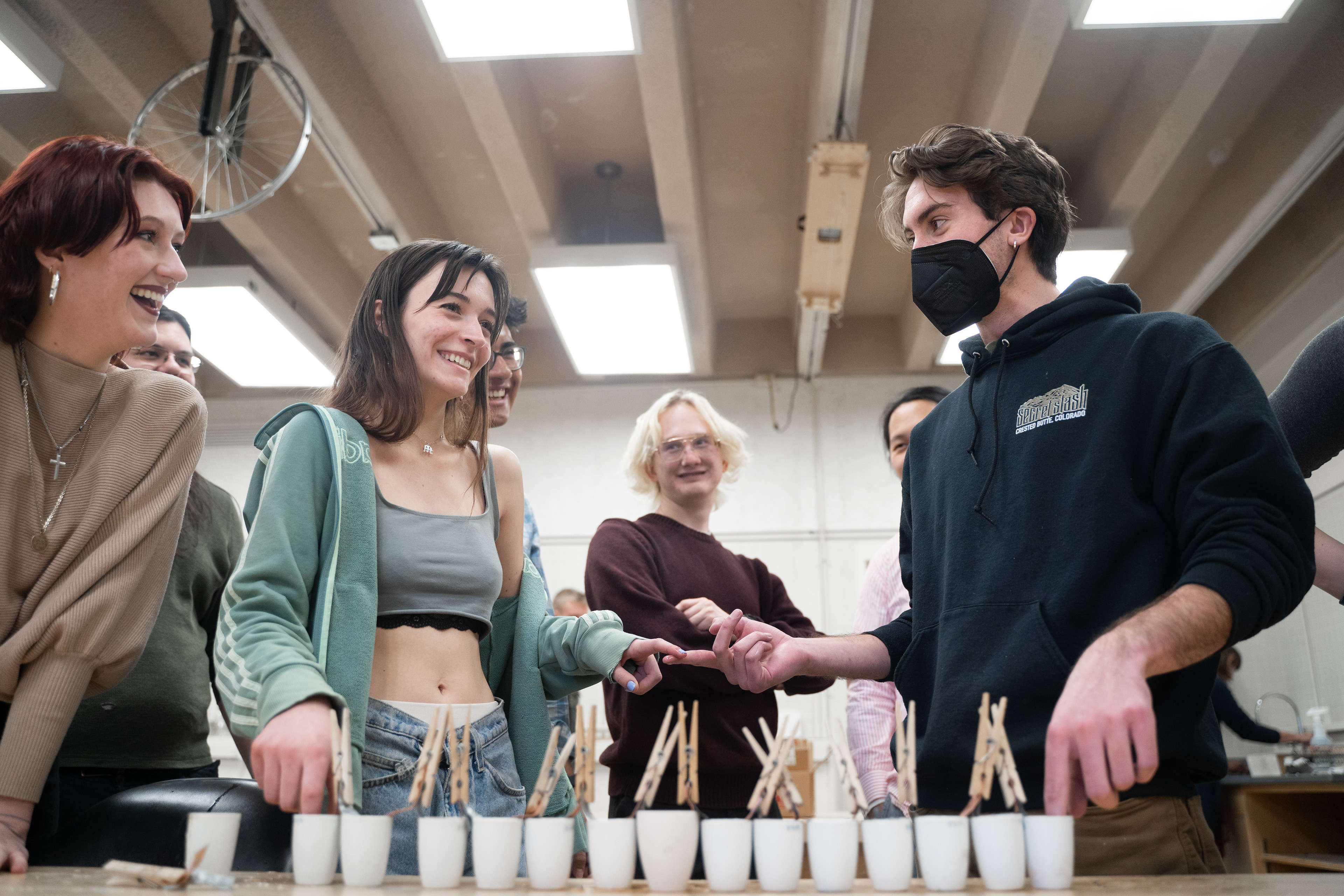 Students in Junior Lab get a first-hand experience of Galileo’s proof that the equable forward motion (rolling on the right-hand side) and the downward force exerted by gravity compound with each other such that the ball traces a parabola across the page as it falls. This is recorded by the trail of paint left on the graph paper.