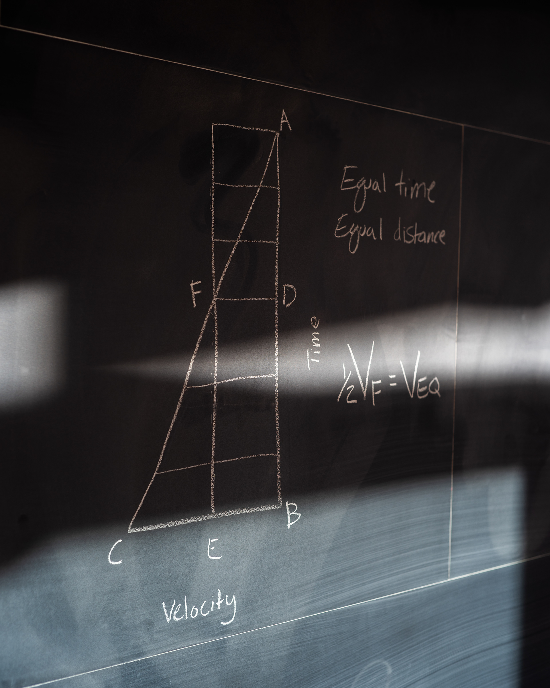 Parabolas are not just any arcing shape—their curves are defined by a specific proportional relationship between the vertical and horizontal distances from the vertex of the parabola. The vertical distances are to each other as the squares of the horizontal distances for any two given points. If we measure the distances traced on the paper by the green ink, we find that a ball falling according only to the natural force of gravity (accelerative) and a constant motion (equable) traces a path through space that follows these exact proportions. Apollonius laid out the characteristic relationship for parabolas in 200 BC, and Galileo was working on this experiment in 1638 AD. What might it look like to grapple with the fact the natural workings of our world accord so closely with geometrical relationships reached thousands of years before?